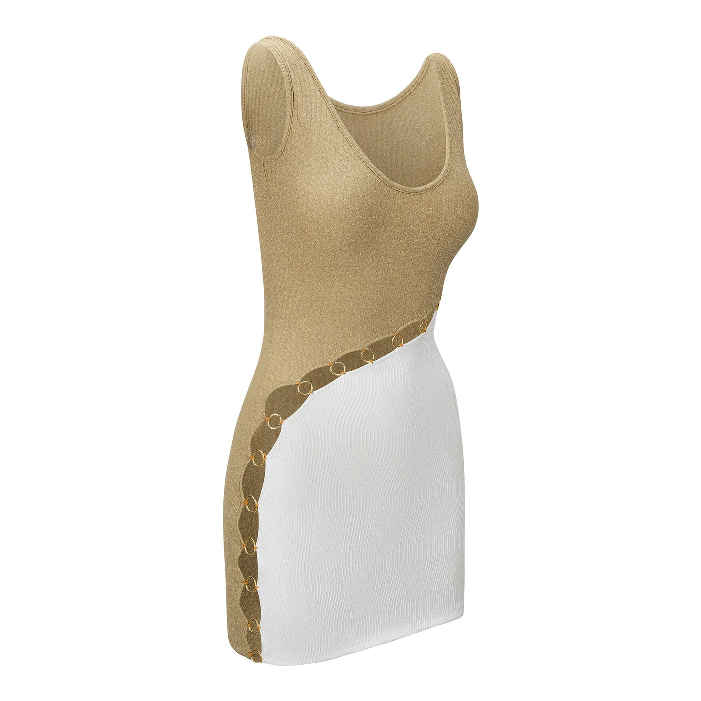 Adornado con doce anillos colocados intrincadamente en la cintura, este vestido agrega un toque de glamour sutil mientras acentúa tu figura de manera impecable.